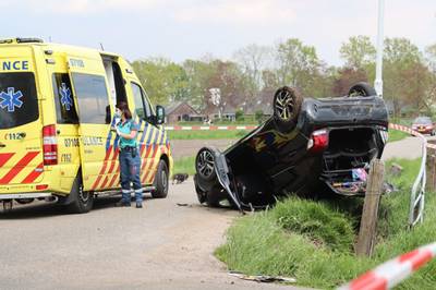 LUNTEREN - Een auto is donderdagmiddag over de kop geslagen bij een botsing in Lunteren. Op de kruising van de Lage Veldweg met de Hammerdijk kwamen twee auto's met elkaar in botsing.